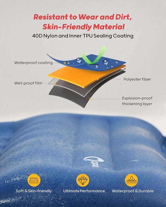 - Durable & Waterproof: Designed to last and withstand the elements of the great outdoors, this cushion is made of TPU Nylon and is waterproof. This inflatable pad can be cleaned with just a wipe thanks to its waterproof surface.