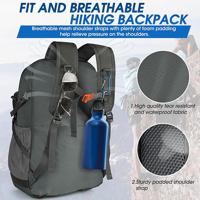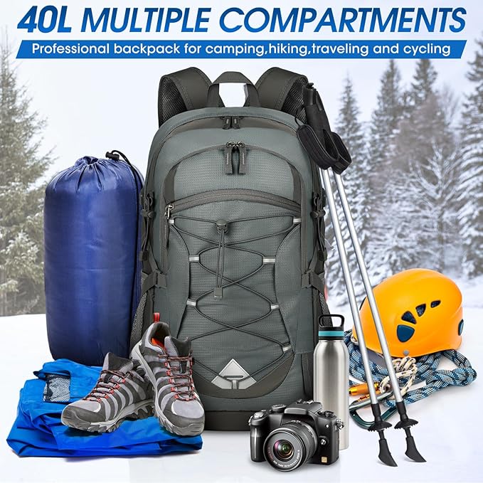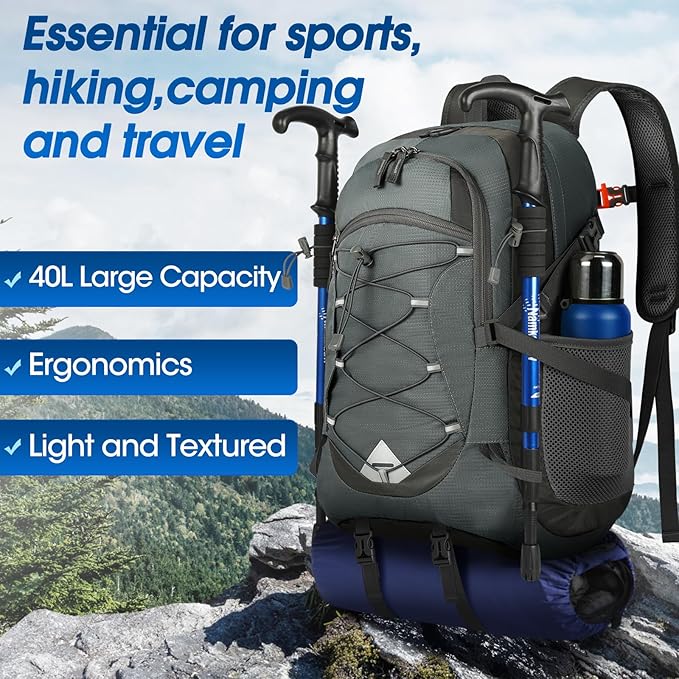 • 【Large Capacity&Multi Compartment】This portable hiking backpack has 40 liters of storage space with a multi-compartment design that includes 1 main zipper compartment, 2 zipper front pockets, 2 side pockets, and a waterproof wet pocket. The pen pocket and slip pockets in the front can help you organize your items more easily. The large capacity backpack helps you to easily storage all your essentials for your outing.
