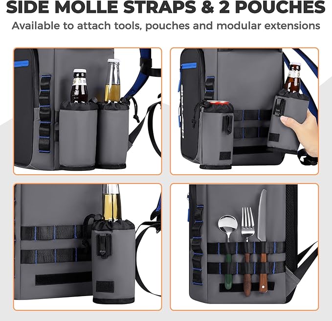 - Unique Function Design - Heytrip cooler backpack boasts a modular and expandable molle system, with front molle straps available for attaching tools, pouches, and modular extensions. The shoulder strap also features a bottle opener, so you can enjoy your favorite brews on-the-go. Additionally, the loop area on the top allows for personalization with a nametape, making your backpack even more unique and stylish.