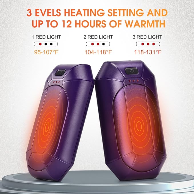 - Instant and safe heating no longer need to wait for a long time, the 2000mAh*2 battery capacity of the mini hand warmer is enough to meet the needs of most winter outdoor sports. One full charge can last up to 12 hours of continuous use, 3-level temperature settings for adjustable, precise, stable and comfortable warmth, 3-level indicator light lets you know the remaining power and heating status.