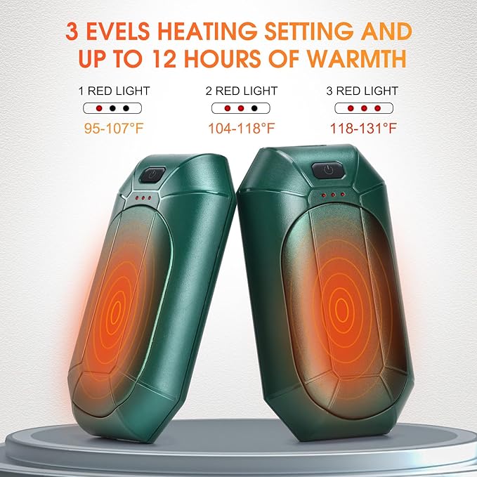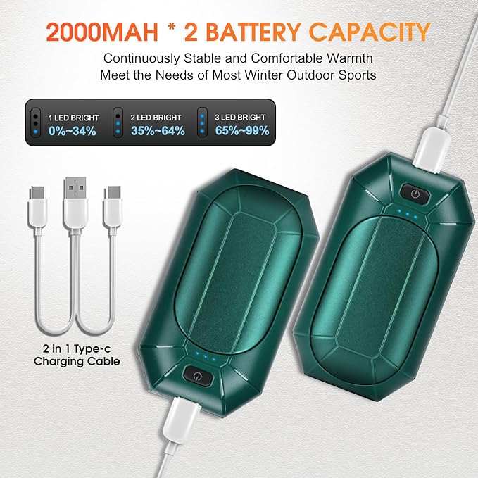 - Instant and safe heating no longer need to wait for a long time, the 2000mAh*2 battery capacity of the mini hand warmer is enough to meet the needs of most winter outdoor sports. One full charge can last up to 12 hours of continuous use, 3-level temperature settings for adjustable, precise, stable and comfortable warmth, 3-level indicator light lets you know the remaining power and heating status.