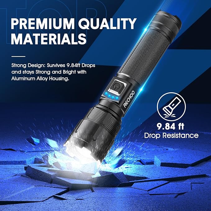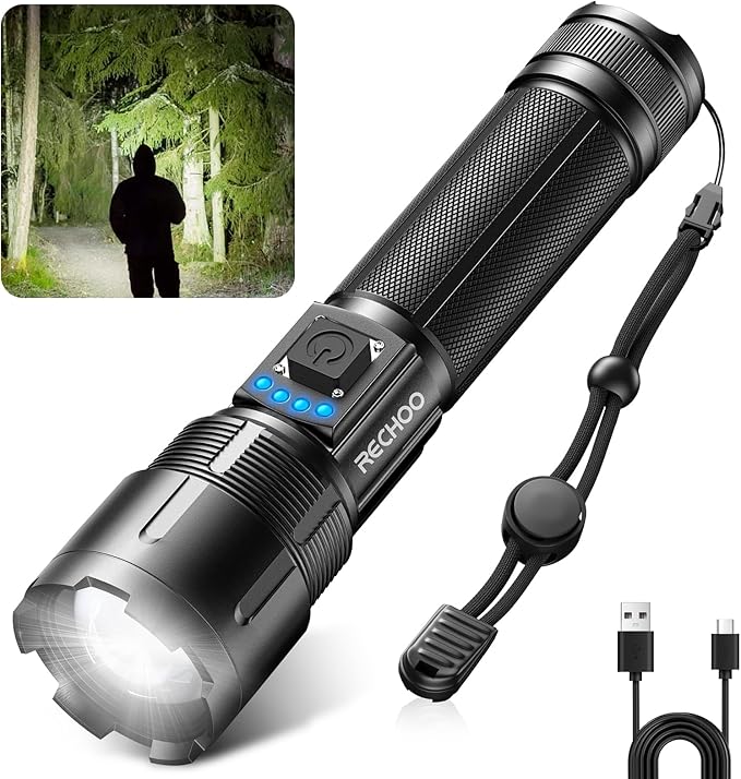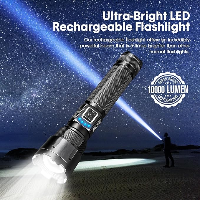 RECHOO Rechargeable Flashlights High Lumens, 10000 Lumens Tactical Flashlights, Super Bright LED Flashlight with 5 Mode & Zoomable, IP65 Waterproof Flash Light for Camping, Hiking, Emergency, Home