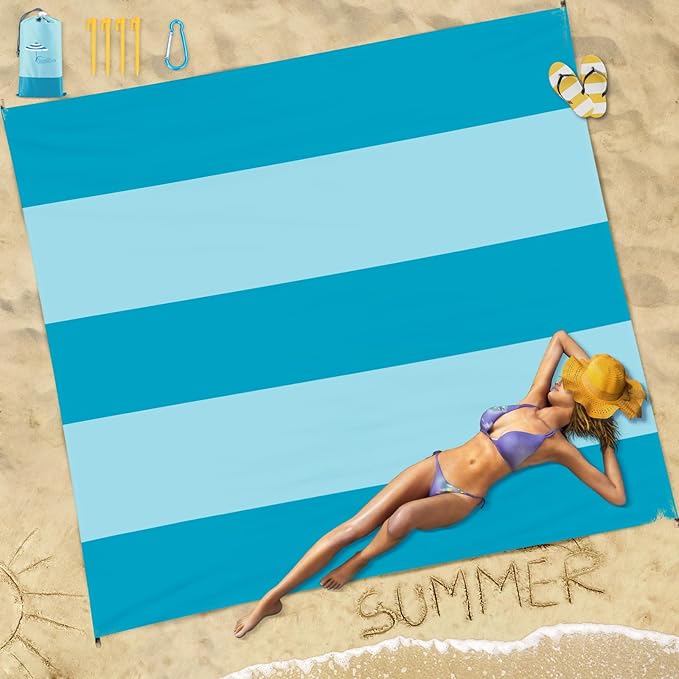 • 🍃BIG BEACH BLANKET:Package includes 1 carabiner,4 ground stakes for 4 anchor loops,to keep it from blowing around on the beach.Perfect for outdoor uses,it will remain secure and stable on windy days.