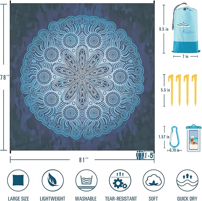 - 🌴BEACH BLANKET SANDPROOF WATERPROOF:78''×81'' fits 1-5 adults.Made with ripstop 210T polyester.The sand will fall down when you shake the blanket.The little water left behind will dry out in minutes.
