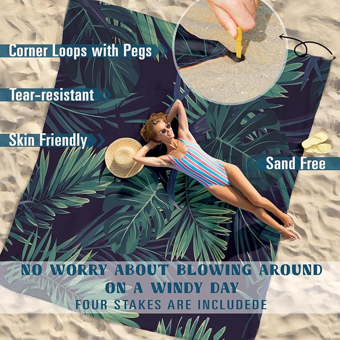 - 🍃BIG BEACH BLANKET:Package includes 1 carabiner,4 ground stakes for 4 anchor loops,to keep it from blowing around on the beach.Perfect for outdoor uses,it will remain secure and stable on windy days.