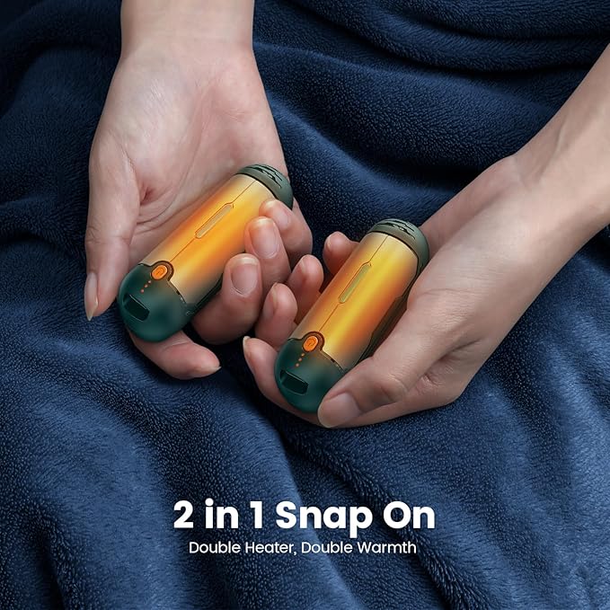 - 【2-in-1 DESIGN】 2023 newest 2 pack hand warmer attached together by snap, you can combine them to create a single palm-sized portable heater, or separate them to warm both hands, or share one heater to your family.