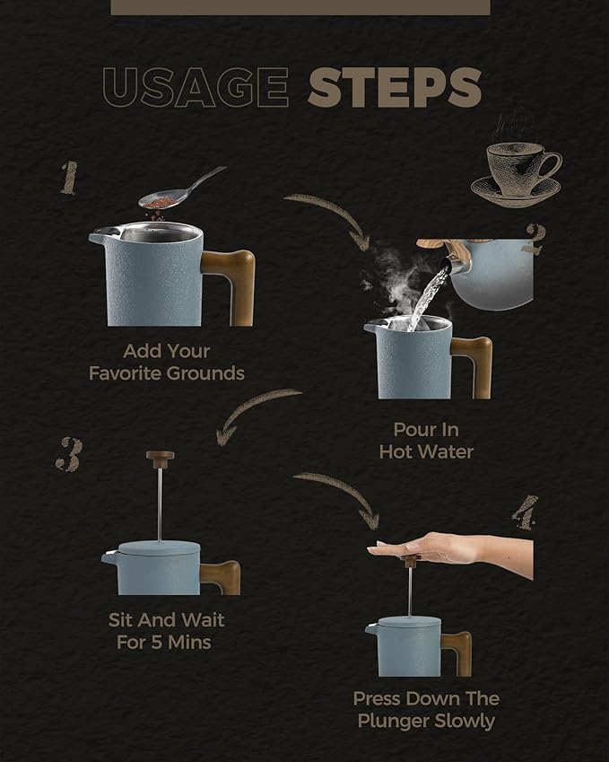 - LOOKING FOR COFFEE PRESS FOR MATCHING UP YOUR KITCHEN? We, the POLIVIAR french press coffee maker will be your smart choice. While the coffee pot is made from food grade stainless steel with stylish long-lasting coating, It is easily to match up your kitchenwares and your kitchen's theme. Also, the ergonomic handle with real wood will maximize the fantastic time of grounds you loved.