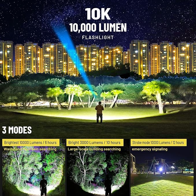 - Powerful Flashlight 10,000 lumens with a beam distance of almost five football fields,zoomable,5000K, CRI95, USB-C fast Rechargeable and the battery level indicator, 10000mAh Battery, Durable aluminum and IPX6 Waterproof, larger light weighs 1 pound and is 10.5 inches long easily fits into backpacks or cars, off-body carry in a pack, drawer, or center console, for outdoor adventures and everyday life