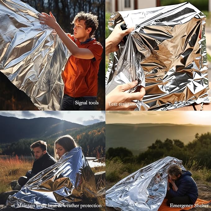 - 【 Lightweight and Portable 】 Made of durable foil polyester film, designed specifically for hiking, camping, and living environments, it can be used as insulation blankets, termites, space blankets, camping emergency blankets, etc. This insulation blanket is compact in size, 52 "x 82", weighs only 1 ounce, and can easily fit into backpacks and pockets. There are 4 life saving bags, each individually packaged for easy use and recycling. Our lightweight insulation blanket can be used for camping supplies, marathons, travel emergency kits, travel emergency boxes, and car emergency equipment.