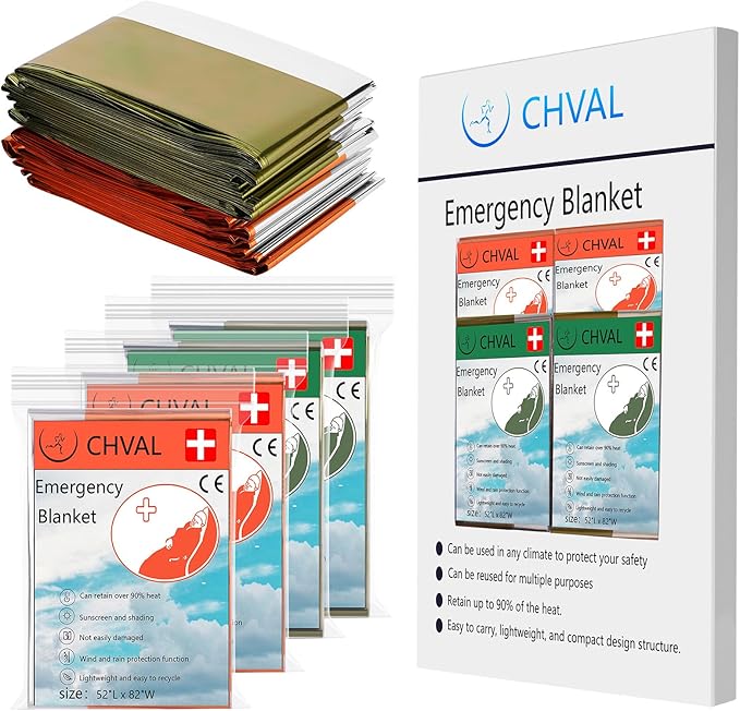 - 【Effective Temperature Retention】CHVAL's mylar blankets is the best choice for life-saving equipment or blankets, utilizing reflection to maintain up to 90% of body heat as a barrier against cold weather. This is a emergency supplies for adventurers andis a emergency space blanket for kids.A polyester film emergency blanket can help homeless supplies