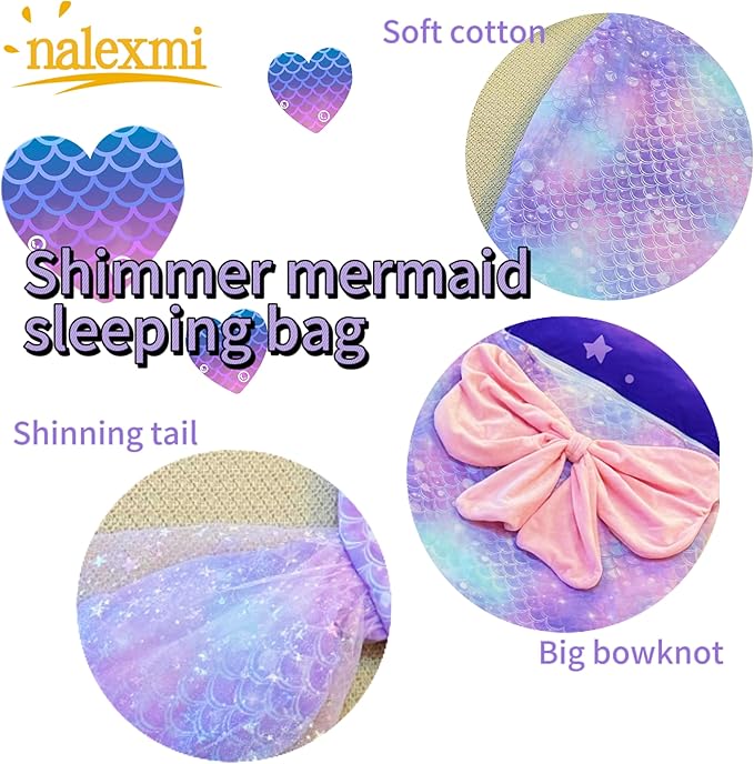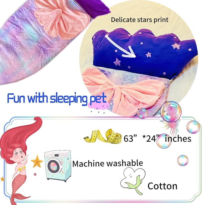 - STYLISH MERMAID DESIGN – Available in a large 68*30 inch size, perfect for growing kids. The shimmering, multicolored tail adds a magical touch—order the larger size for extra comfort