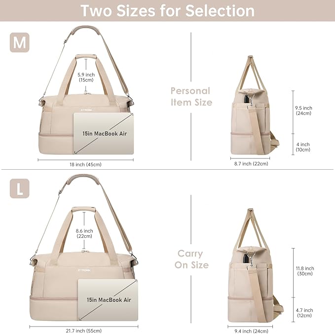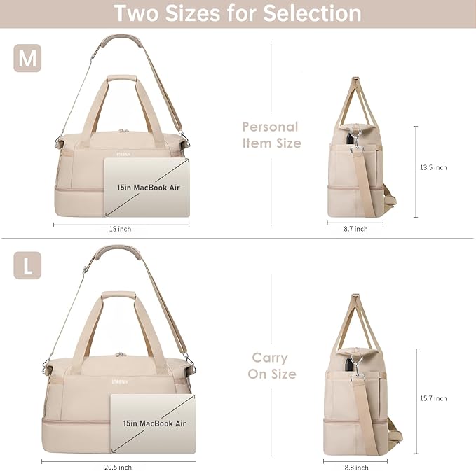 - Extra Large Size:With dimensions of 20.5 x 8.8 x 15.7 inches, our new and improved gym bag offers even more space to store your clothes, towels, toiletries, shoes, and other essentials. Suitable for 5-7 days of travel, not recommended as a personal item bag