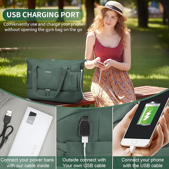 ETRONIK Gym Bag for Women, 47L Carry On Travel Duffel Bag with Shoes Compartment, Weekender Overnight Bag with Wet Pocket & USB Charging Port for Women, Travel, Gym, Weekend, Large Size (Dark Green)