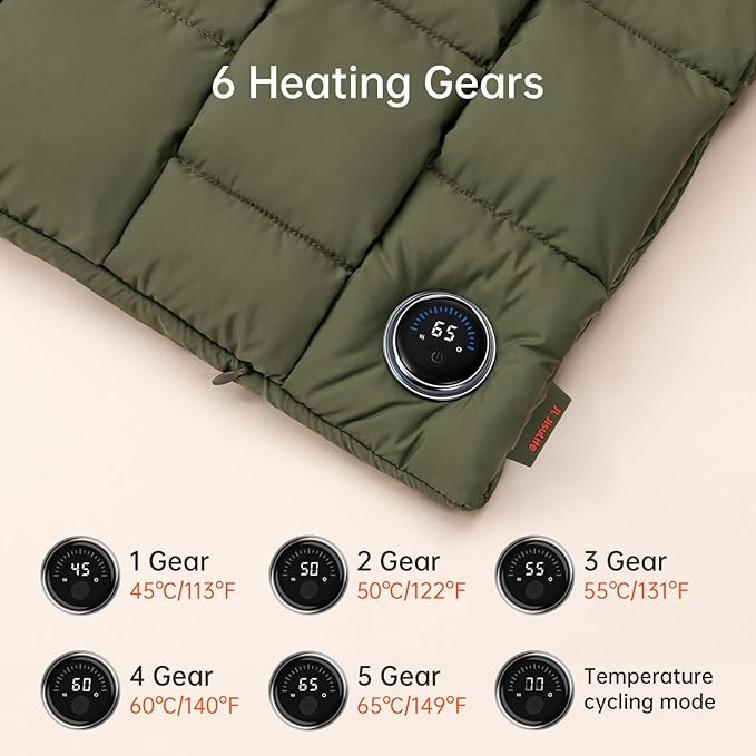 - 【6 Temperature Gears】The Hand Warmers feature 6 heating gears. To activate the heating gloves, simply press and hold the power button. From there, use short presses to cycle through the different temperature settings: 45°C, 50°C, 55°C, 60°C, 65°C, and Auto mode. In Auto mode, the hand warmers will cycle through the previous temperature settings, for up to 4 hours before automatically shutting off. Please note that you need to turn on the power bank before using the hand warmers.