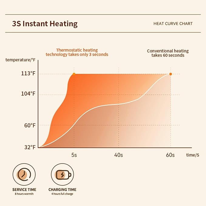 - 【Multifuction Electric Hand Warmer】Quick hand warmer & Power bank 2-in-1.The hand warmer is equipped with a 6000mAh rechargeable battery, which allows it to run for 3-8 hours on a full charge, providing you with plenty of warmth. It can also be used as a power bank to charge your electronic device at any time. So you don't have to worry about your electronic devices running out of battery when you're out and about