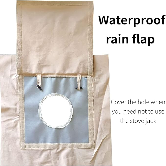 - WATERPROOF CANVAS STOVE JACK:Velcro design with rain flap closes securely. Cover the hole with button when you do not want to use the stove. Note: This product is high temperature resistance but NOT fireproof.