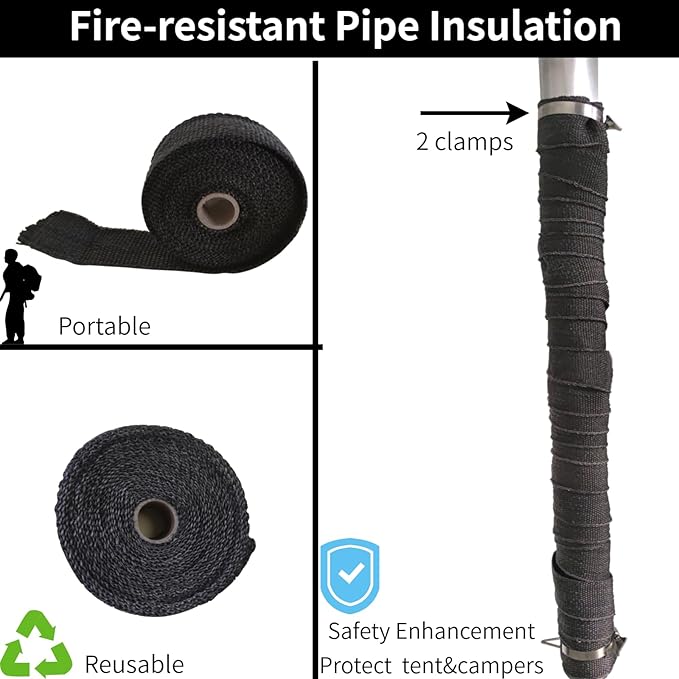 - FIREPROOF PIPE WRAP: 16.4ftx1.96inch(LxW) Fire-resistant fiberglass that can withstand high temperatures when you using tent stove. As a barrier between the hot stove chimney and any accidental contact, protecting you and your tent from burns.