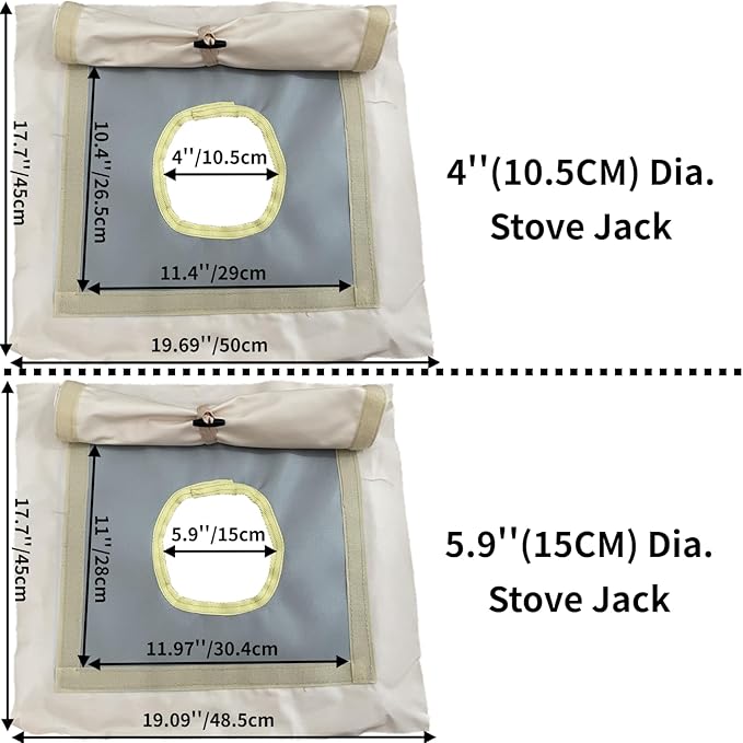 - SIZE OF STOVE JACK: Round hole Dia. :5.85’’. The size of stove jack is 19x19.5 inches.(Have the extra canvas around the outside to glue and sew in)Grey rectangle size:11x11.5 inch. Thickness: About four A4 papers