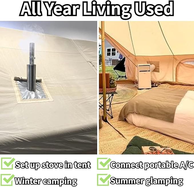 - 4 SEASON WIDE USING: In winter,you can set a stove to warm your tent. In summer,you can install it on the side wall of the bell tent for connecting electric inlet or A/C pipe.Nice camping accessories for keeping canvas tent from damaged.