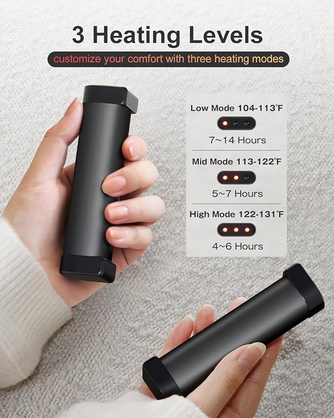 - 🌡【Three-Level Temperature Adjustment】Customize your warmth with three temperature settings. Easily switch between low mode (104-113℉), medium mode (113-122℉), and high mode (122-131℉) with a single button press. Avoid prolonged use at high temperature in the same spot.