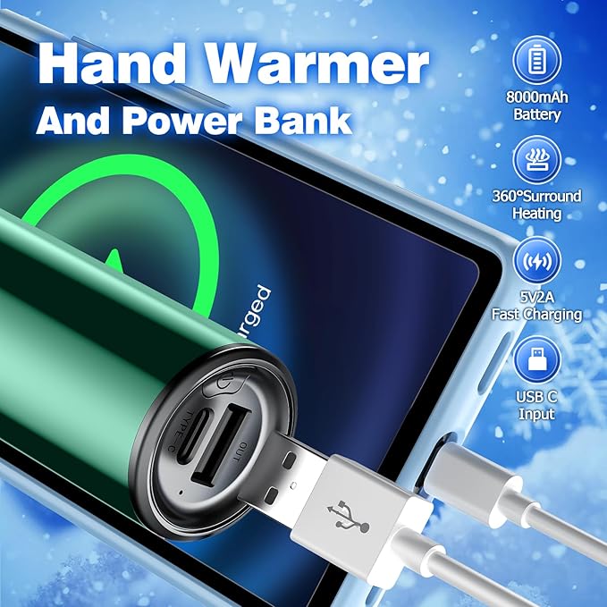 Hand Warmers Rechargeable, 1 Pack 8000mAh, Electric Portable Pocket Hand Warmer, 2 in 1 Hand Warmers and USB C Power Bank, Great Winter Warm Gifts for Ourdoor, Camping, Hunting, Girls