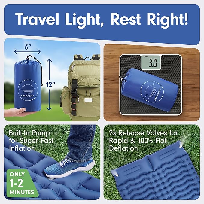 - PROPERLY SUPPORTIVE! The sleeping mat camping pad is designed for any sleep position. With this sleeping bag pad, your sleep is actually restorative, even in harsher conditions: the ergonomic shape supports the human body in a healthy position