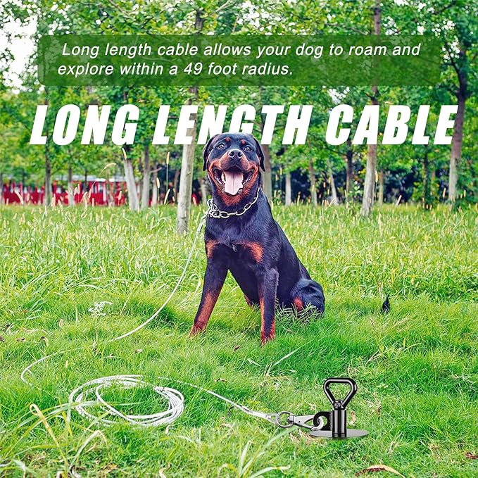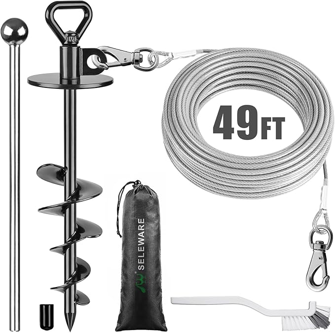 SELEWARE 49 ft Dog Tie Out Cable and Stake, Anti-Rust Dog Anchor with Composed of Stainless Steel Wire Cable for Large Dogs up to 220 lbs, Free Swivel Dog Stake Dog Camping Gear