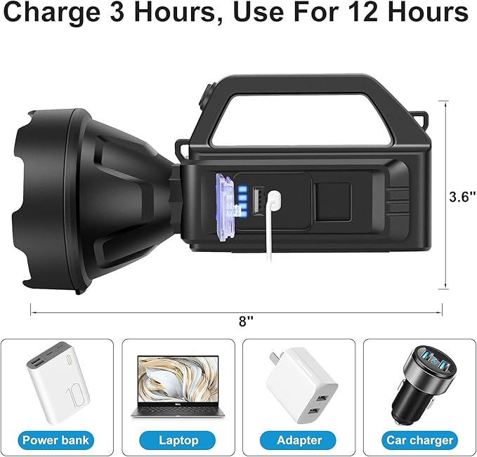 - 【USB Rechargeable & Power Display】USB Rechargeable spotlight equipped with power display and USB output port. You can see the power at a glance no more guessing the remaining power of flashlight. It is also a backup power source for mobile phone, charge your device easily in case of emergency.