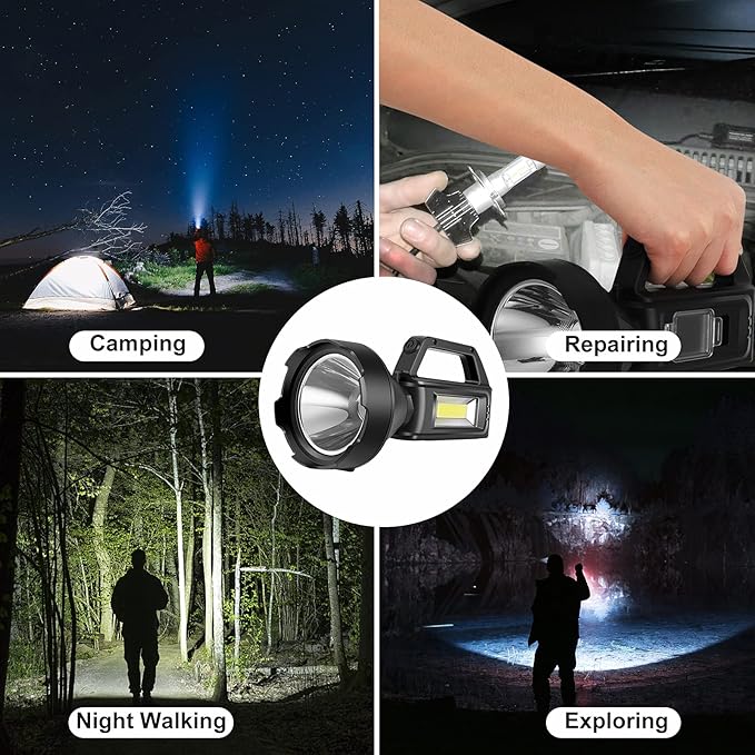 - 【4 Light Modes & Waterproof 】This handheld spotlight front light provides 4 Light Modes High, Low, SOS and Floodlight Side Lamp. According to your choose of different mode, the working time can up to 6-12 hours. Waterproof spotlight can be used normally in bad weather.