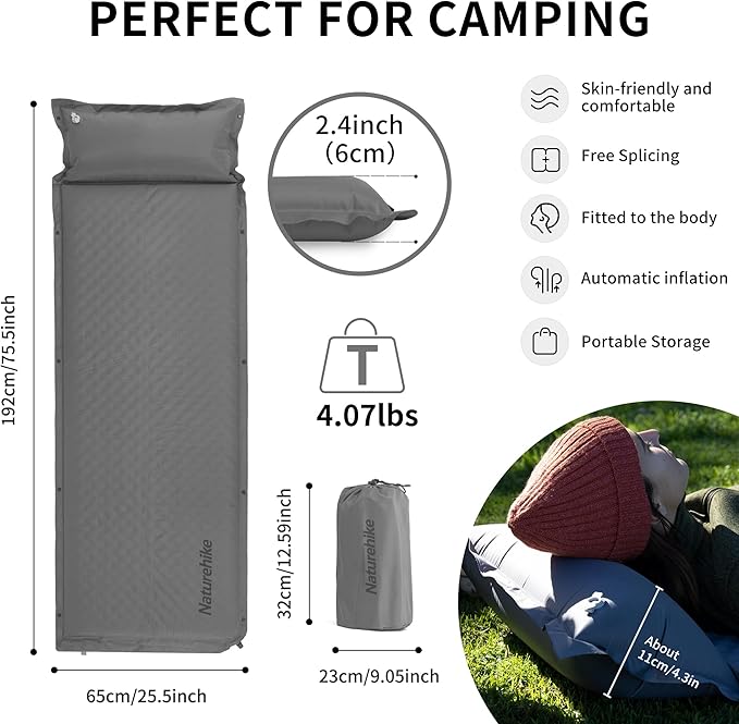 Naturehike Sleeping Pad, 2.4 inch Thick Self Inflating Sleeping Pad for Camping, Durable Camping Mattress Connectable with Multiple, Lightweight Sleeping Mats for Backpacking, Tent, Hammock, Hiking