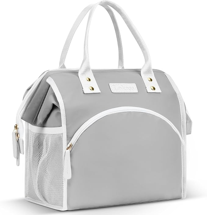 LOKASS Lunch Bag Women Insulated Lunch Box Wide-Open Lunch Tote Bag Large Waterproof Cooler Bag for Work Picnic Hiking Beach(Gray)