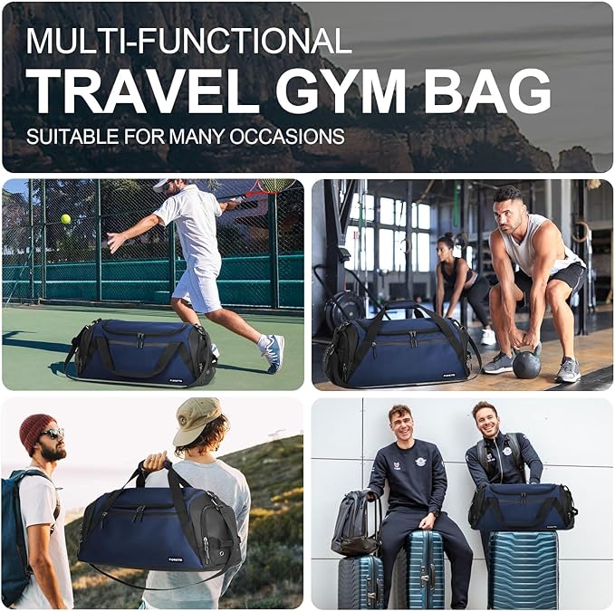 FIORETTO 43L Mens Sports Gym Bag with Wet Pocket & Shoe Compartment, Travel Duffle Bag Overnight Bag with Padded Shoulder Strap, Holdall for Swimming, Basketball, Football Navy
