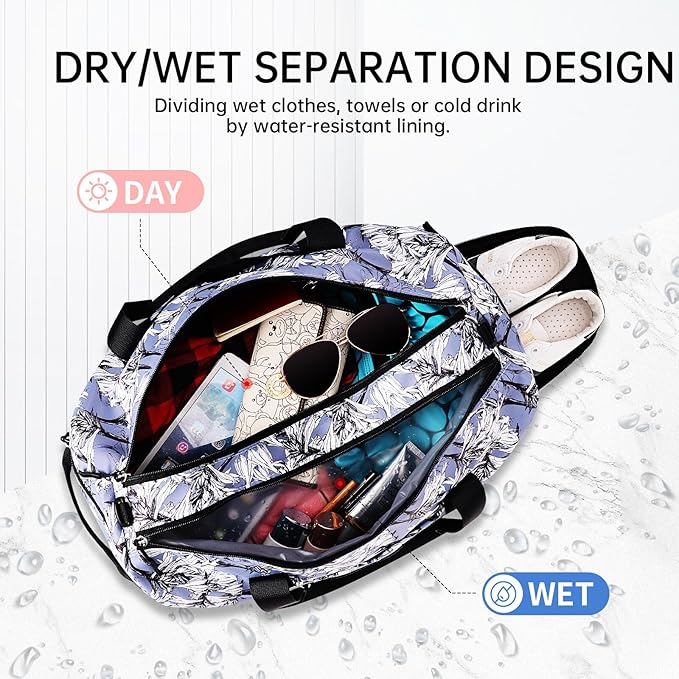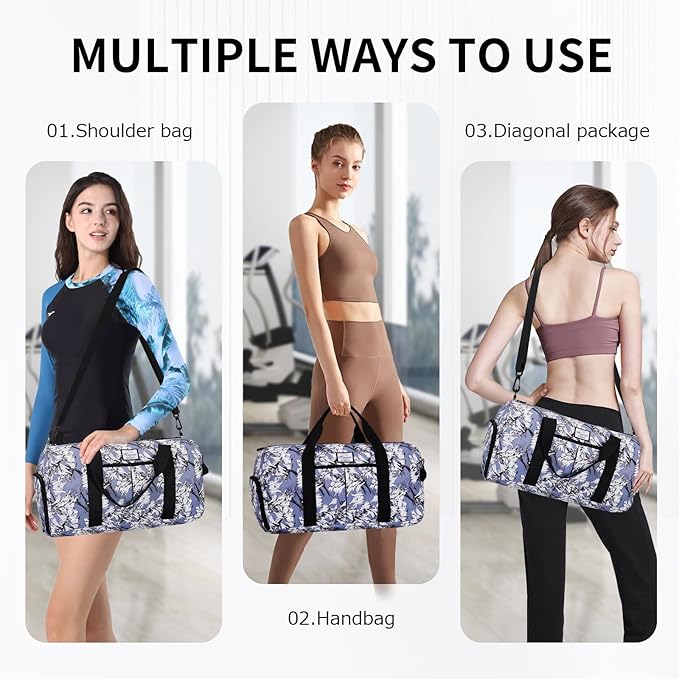 - 【DRY WET SEPARATE GYM BAG】This duffle bag for women delivers roomy main compartment to store your clothes and items. A zippered waterproof PVC lined pocket for wet clothes or towels and swimsuits, effectively separating dry and wet items.