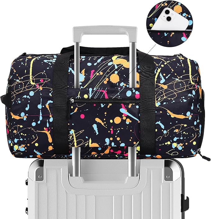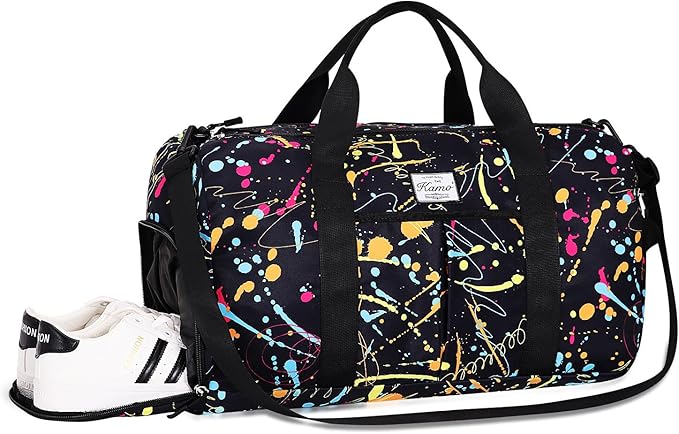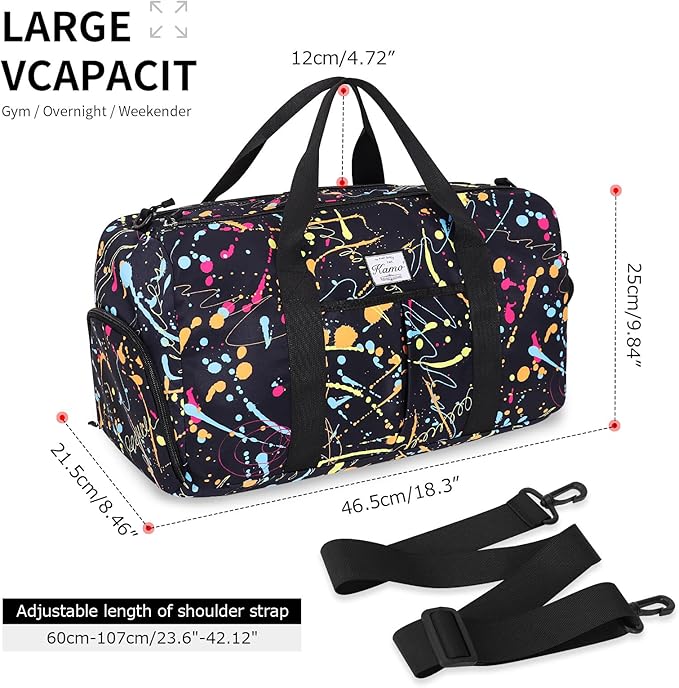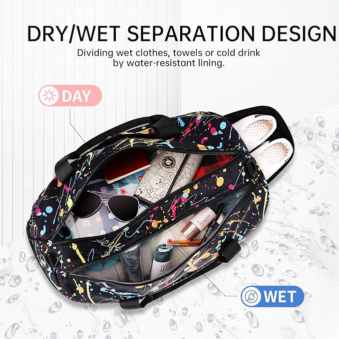 • 【DRY WET SEPARATE GYM BAG】This duffle bag for women delivers roomy main compartment to store your clothes and items. A zippered waterproof PVC lined pocket for wet clothes or towels and swimsuits, effectively separating dry and wet items.