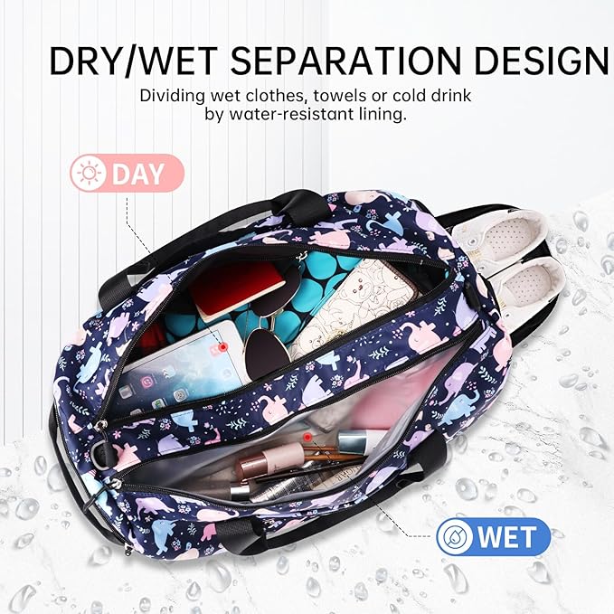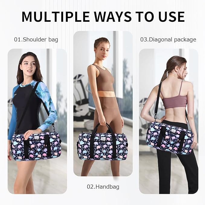 • 【DRY WET SEPARATE GYM BAG】This duffle bag for women delivers roomy main compartment to store your clothes and items. A zippered waterproof PVC lined pocket for wet clothes or towels and swimsuits, effectively separating dry and wet items.