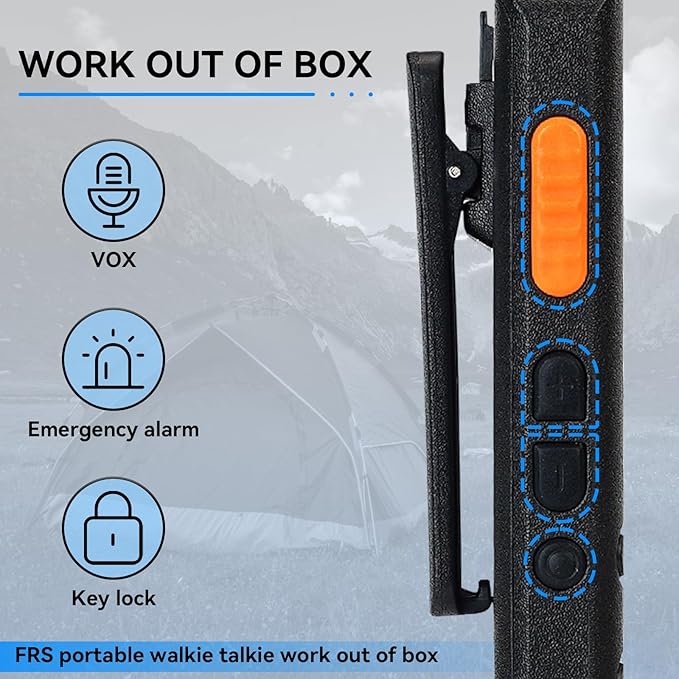 - Emergency alarm walkie talkie ; convenient in asking for help in the event of emergency; press the down key of two way radio to turn on