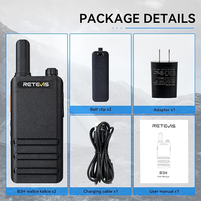 - Included Components : 2X Retevis B3H Walkie Talkie(included 1620 mAh Li-ion battery), 1X English Manual, 2X Belt clip, 1X USB-C Charging cable & Charger adapter 2X Retevis B3H Walkie Talkie(included 1620 mAh Li-ion battery), 1X English Manual, 2X Belt clip, 1X USB-C Charging cable & Charger adapter