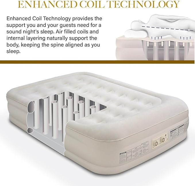 - Extra thick durable waterproof comfort quilt top with extra spinal support - firm mattress provides good sleeping posture - sueded top keeps bedding in place. The built-in pump features separate inflate and deflate knobs for simple and fast inflation.