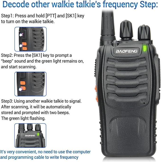 - Copy Frequency: Easily decipher the frequency of another ham walkie talkie without the need for computer programming.