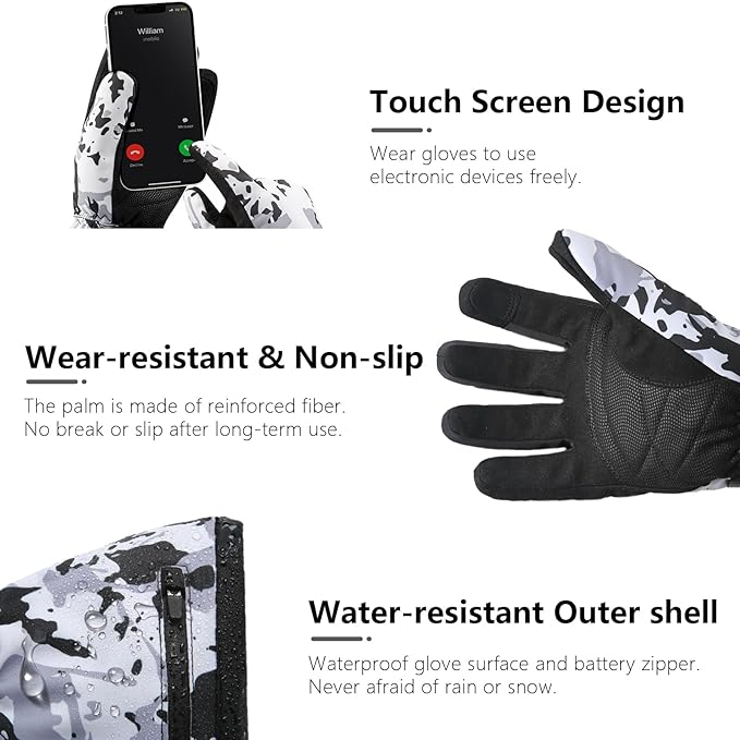 • Durable & Windproof & Waterproof: The palm part is made of superfine fiber, which is more wear-resistant, more non-slip and has a longer lifespan than other gloves made of PU material. The surface of the glove and the battery pocket are designed to be waterproof and windproof. Keep your hands dry and warm while skiing, riding motorcycles, working, hunting, hiking, biking and other sports