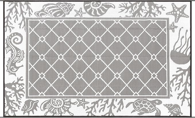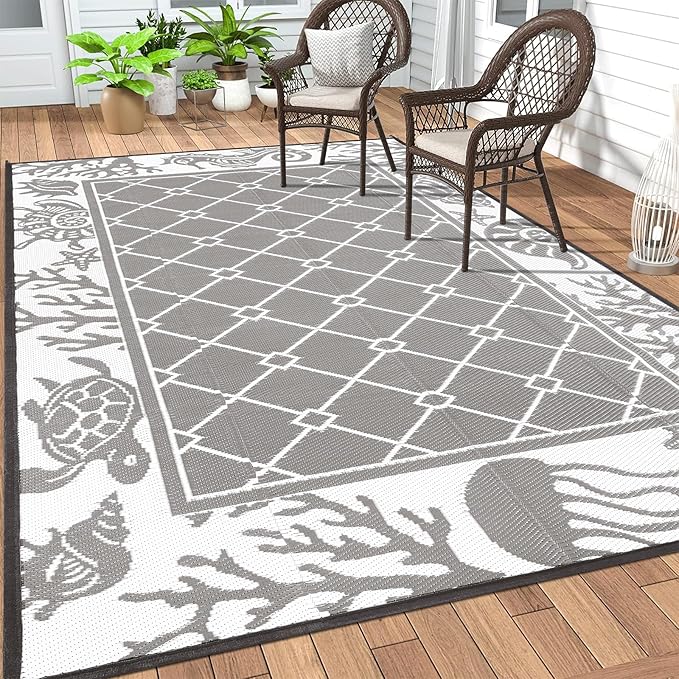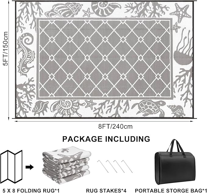 Vaukki Reversible Rugs, Plastic Straw Outdoor Doormat, Fade Resistant Plastic Outdoor Patio Mat, Lightweight Ocean Area Carpet for Patio, RV, Camping, Beach, Deck, Backyard and Picnic (Grey, 5'x8')