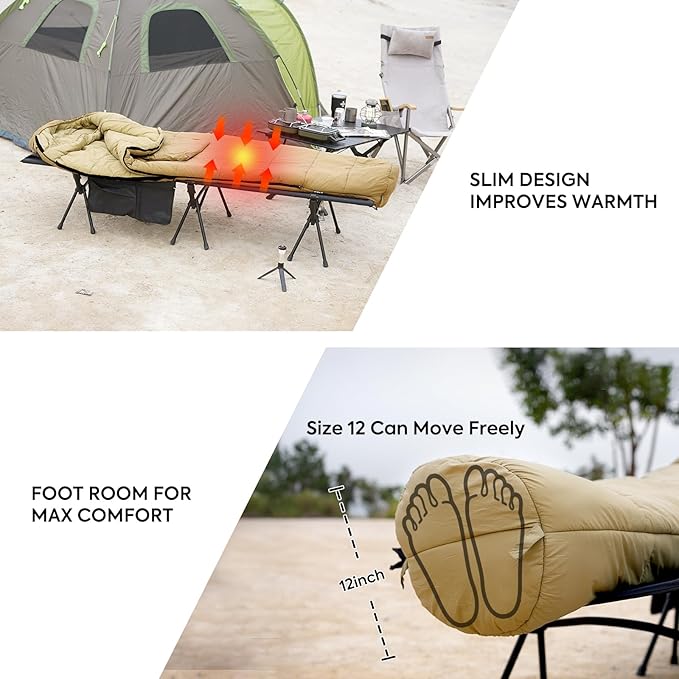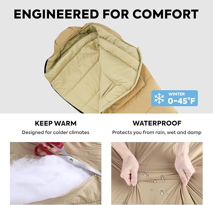 - Ultimate Warmness - Suitable Temperature: 0°C to 45°C. Mummy sleeping bags are designed to conform to the shape of the human body, wrapping around you from your toes to your head to keep you warm. Sleep soundly until dawn, even in winter camps. The hood has a collar hem and windbreak, and two drawstrings inside and out allow you to adjust the size of the hood to prevent heat loss.