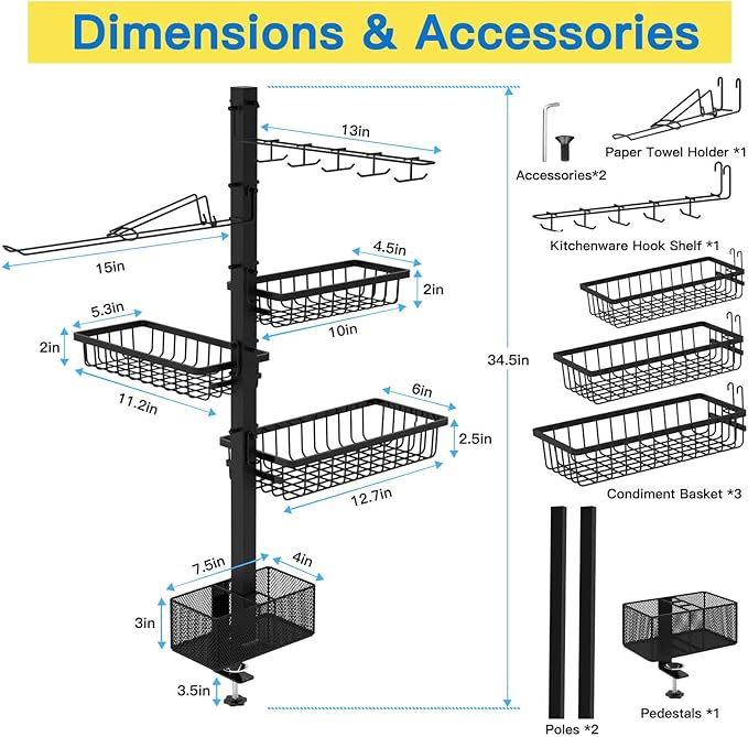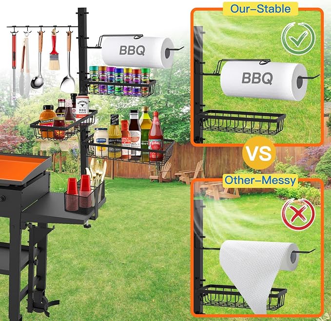 - 【High Quality & Large Capacity】: This blackstone griddle accessories adopts high-quality powder coating + high-quality steel material structure to ensure its durability. In addition to this, we have equipped the product with a total of three spice racks. With a 10-in-1 tool hook and paper towel holder, all barbecue supplies are organized and stored at once, so the countertop is no longer cluttered!