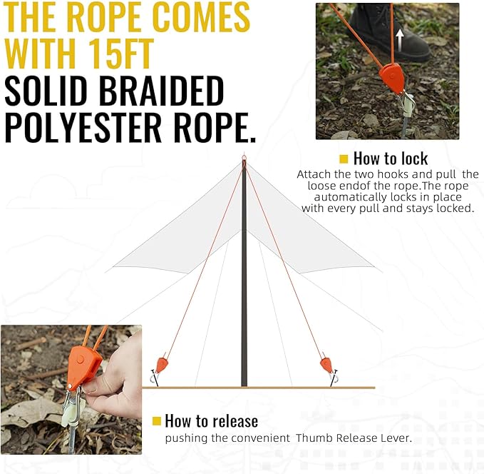 - 【USAGE METHOD】How to lock: Attach the two hooks and pull the loose end of the rope.The rope automatically locks in place with every pull and stays locked.How to release: pushing the convenient Thumb Release Lever.