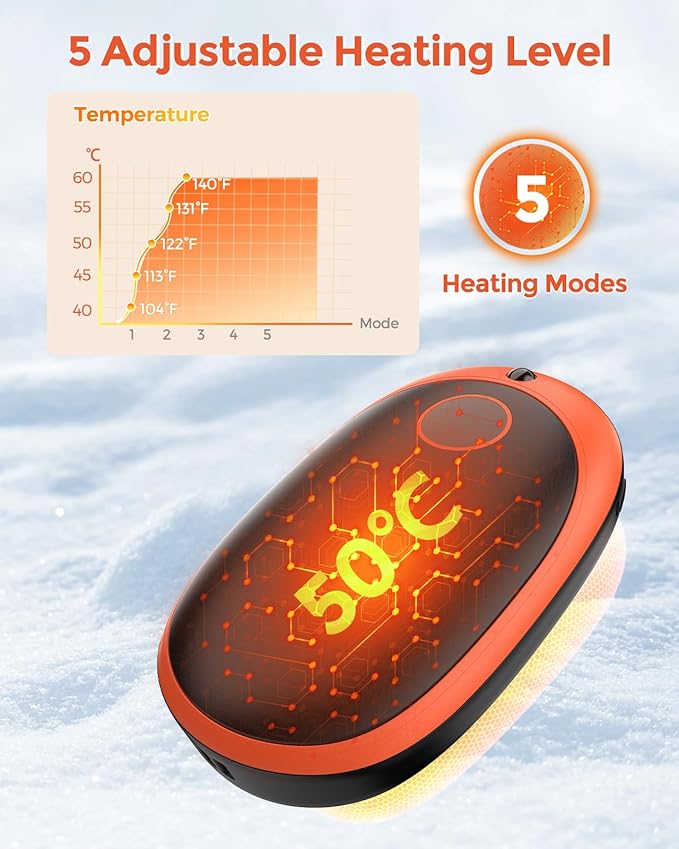 - 【Double-Sided Heated& 5 Temperature Mode】Our rechargeable hand warmer equipped with dual-sided heating technology and offers 5 temperature settings: 104°F (40℃), 113°F (45℃), 122°F (50℃), 131°F (55℃), and 140°F (60℃). Whether you're out hunting, ice fishing, or camping in the snowy wilderness, you can effortlessly fine-tune the temperature of the electric hand warmer to get the quick warmth you need, ensuring your comfort in the cold.