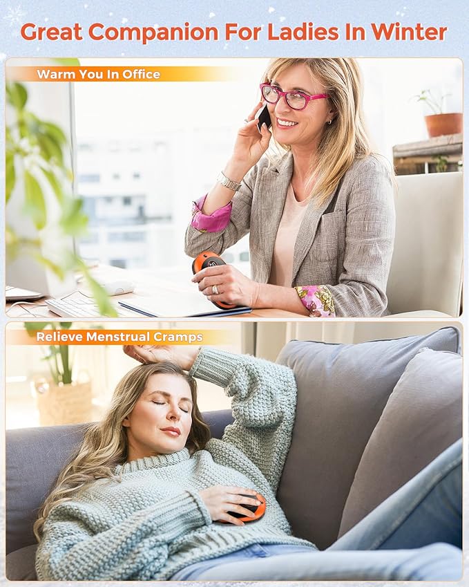 - 【Pain Relief Companion】Our rechargeable hand warmer, powered by therapeutic heat, is your go-to solution for alleviating the discomfort of Raynaud's syndrome, menstrual cramps, joint pain, dry skin, and frostbite. When those painful menstrual cramps strike, with this portable hand warmer, you can say goodbye to the woes of period pain. And for seniors, this hand warmer ensures they can enjoy outdoor activities without fretting about joint pain sidelining them.