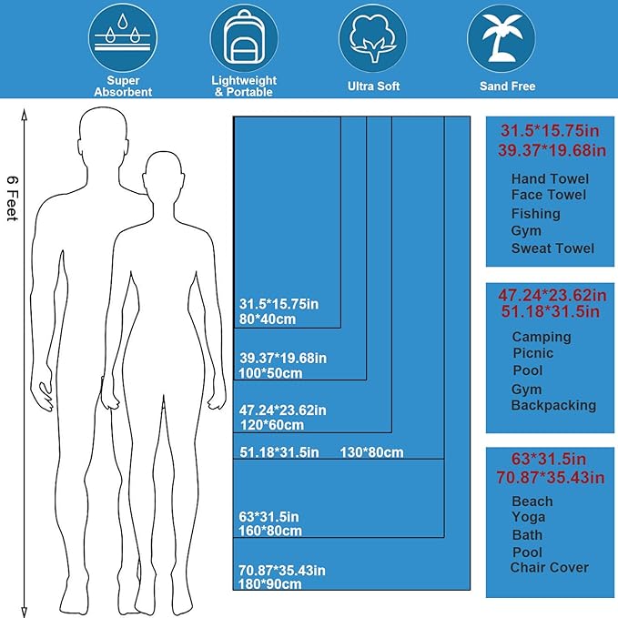- 【6 Sizes & Multi Use】WSZBDY microfiber towel set has 71*35.5in suitable for daily use, right size for your face, neck or hands to wipe the sweat off.best for backpacking, travel, camping, swimming, yoga, gym.