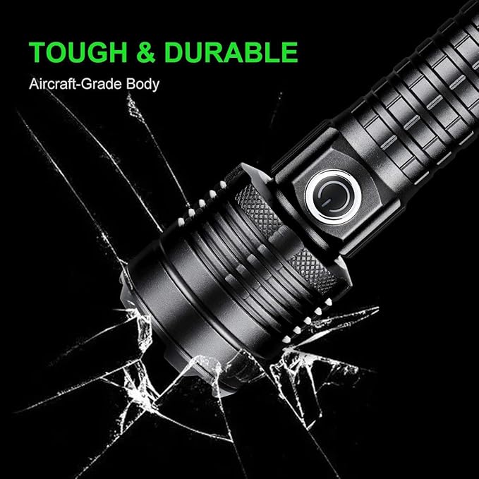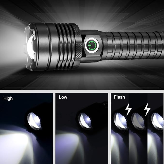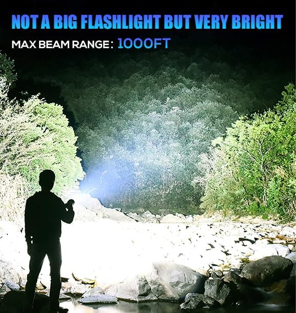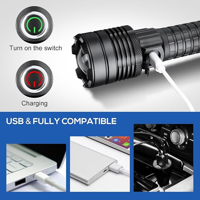 - Super Bright Flashlight: Equipped with upgraded P60 LED wick, its maximum brightness is 2000 lumens. The usb c flashlight can cast a wide beam that light up a whole room or backyard easily and illuminate the things within 1000 feet clearly.
