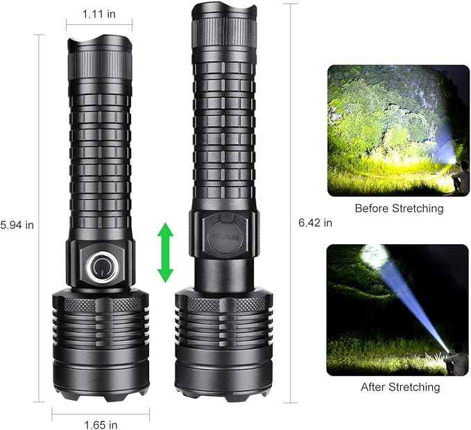 - Zoomable: Rechargeable telescopic zoom flashlight, you can switch between spotlight and floodlight modes by stretching the light head. You can easily focus on objects hundreds of feet away or zoom out to scan an area as large as 1000 feet.