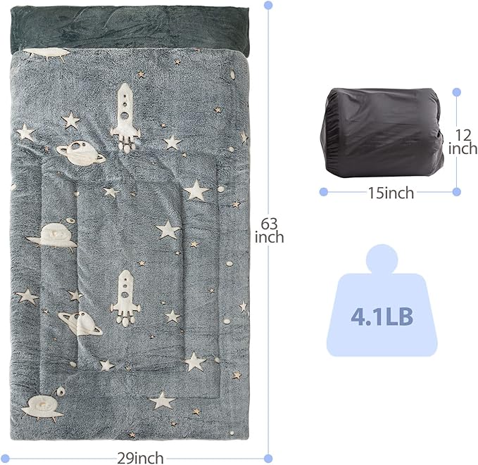 - 【Warm Tips】Due to its vacuum packaging, the glow-in-the-dark kid sleeping bag may arrive with wrinkles. These can easily be smoothed out by either letting it rest for a while or washing it.